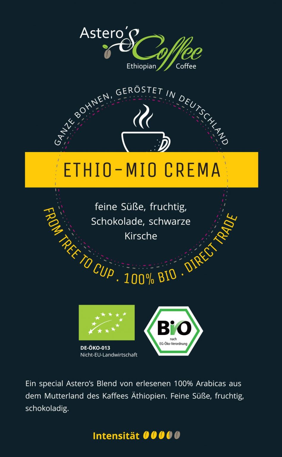 A special Astero’s blend of select 100% Arabica coffees from Ethiopia, the birthplace of coffee. Delicately sweet, fruity, and chocolatey.