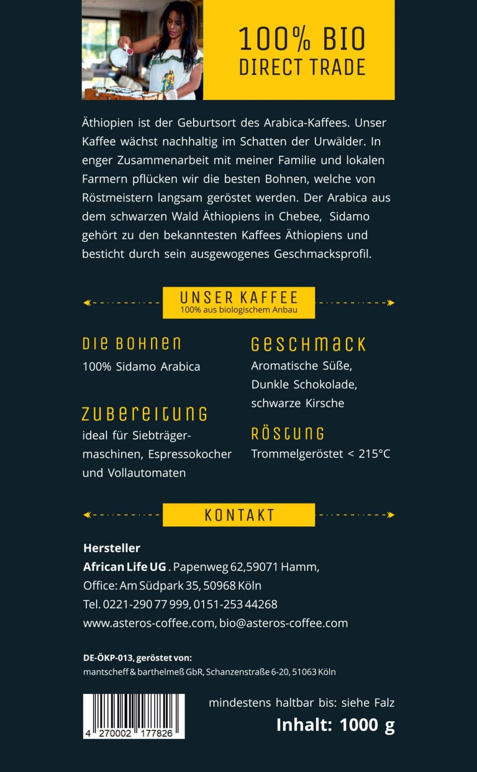 Ethiopia is the birthplace of Arabica coffee. Our coffee grows sustainably in the shade of the rainforests. In close collaboration with my family and local farmers, we pick the finest beans, which are then slowly roasted by master roasters. The Arabica from the Black Forest of Ethiopia in Chebee, Sidamo, is among the most renowned coffees in Ethiopia and impresses with its well-balanced flavor profile.