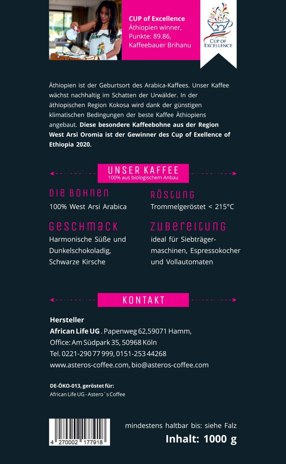 Ethiopia is the birthplace of Arabica coffee. Our coffee grows sustainably in the shade of the rainforests. Thanks to the favorable climatic conditions, the best coffee in Ethiopia is cultivated in the Kokosa region. This exceptional coffee bean from the West Arsi Oromia region is the winner of the 2020 Cup of Excellence of Ethiopia.